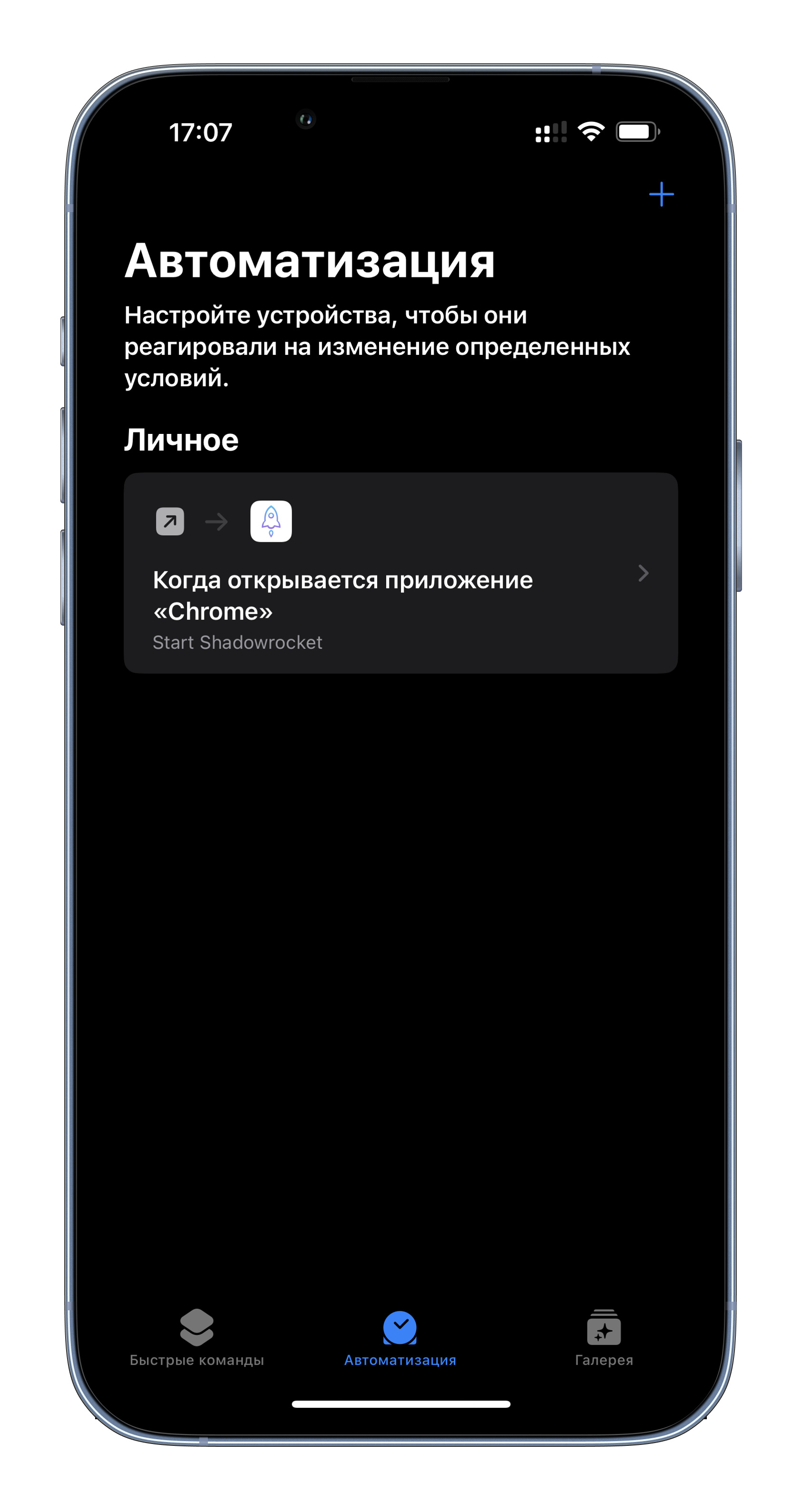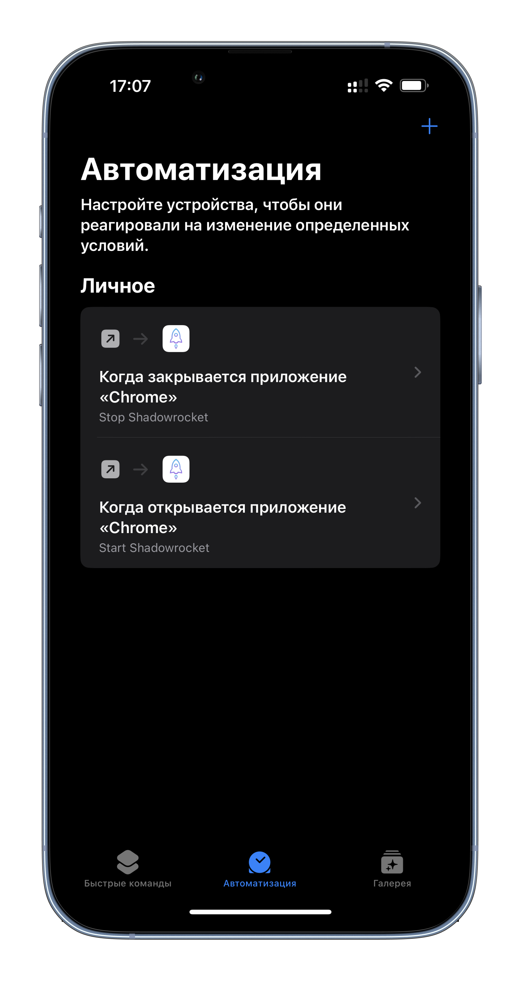 Теперь нажмите на плюсик сверху и создайте ещё одну автоматизацию по такому же принципу, только теперь сделайте чтобы при закрытии этих же приложений выполнялась команда «Stop Shadowrocket». В результате у вас будет вот такой список из двух автоматизаций:
