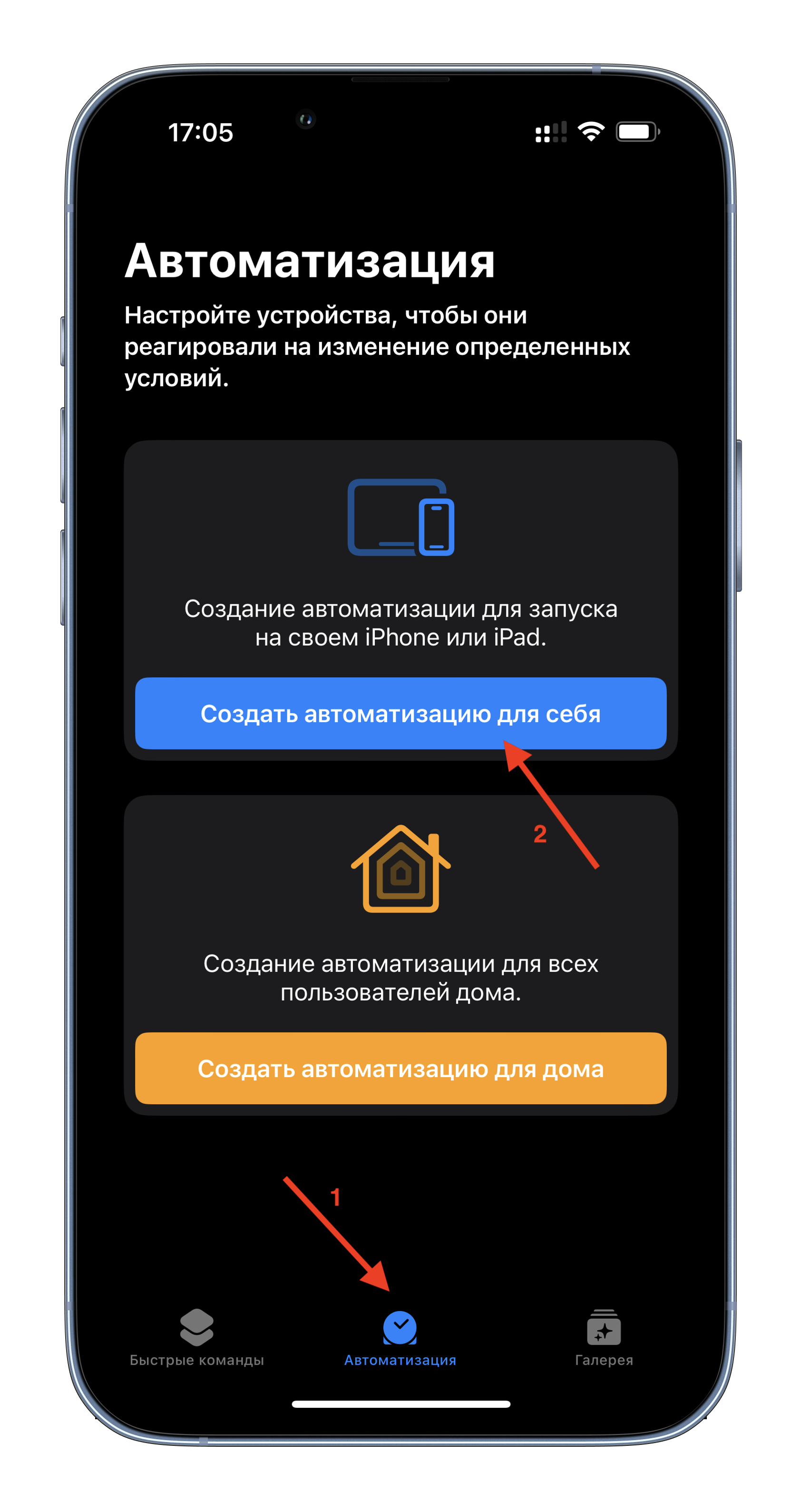 Теперь запустите приложение «Команды». В нижнем меню выберите раздел «Автоматизация» и нажмите кнопку «Создать автоматизацию для себя».