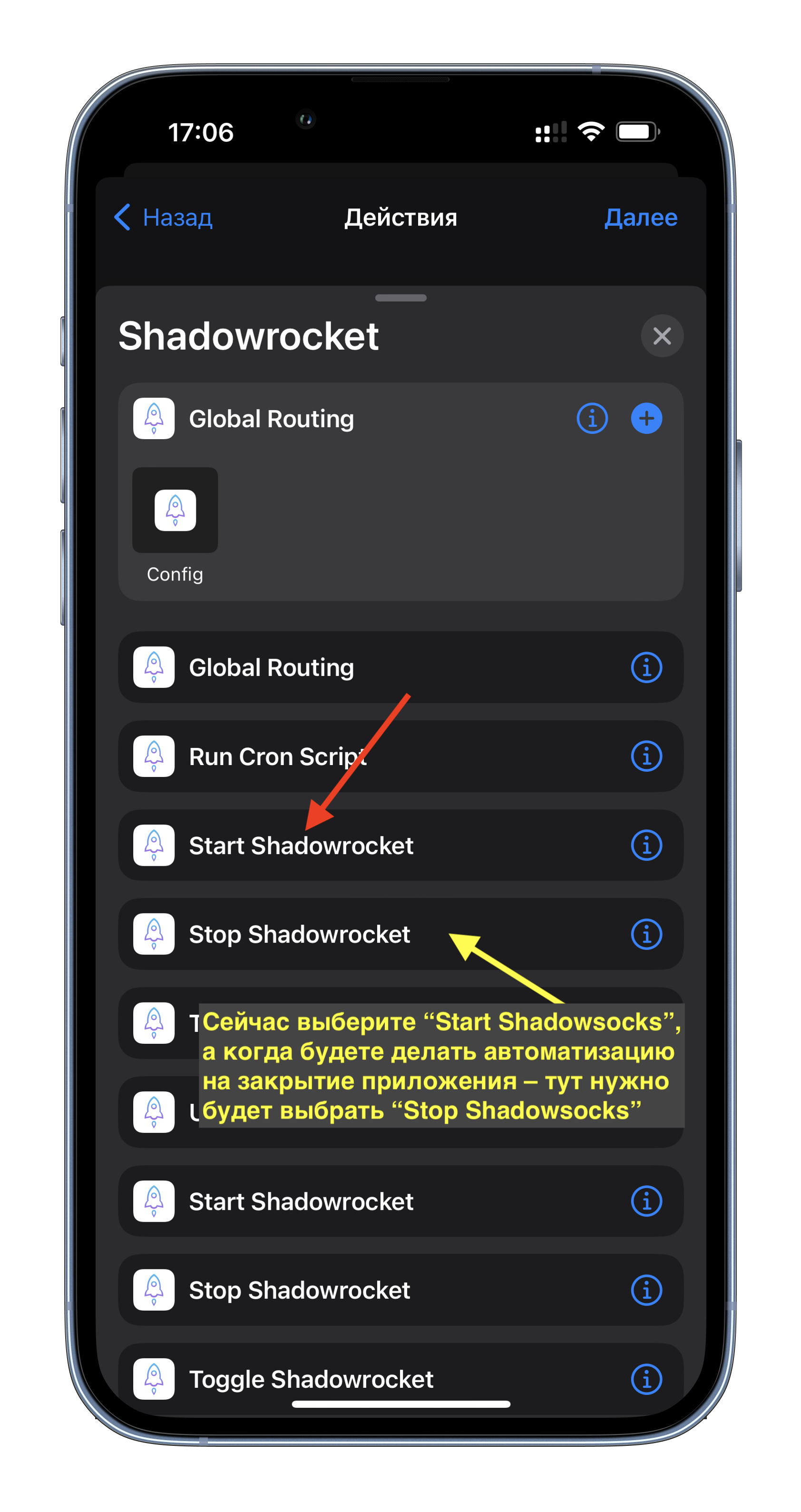 Теперь нужно выбрать, какое действие будет выполняться при запуске выбранных приложений. Зайдём во вкладку «Приложения» и выберем там «Shadowrocket». Затем выберем «Start Shadowrocket»