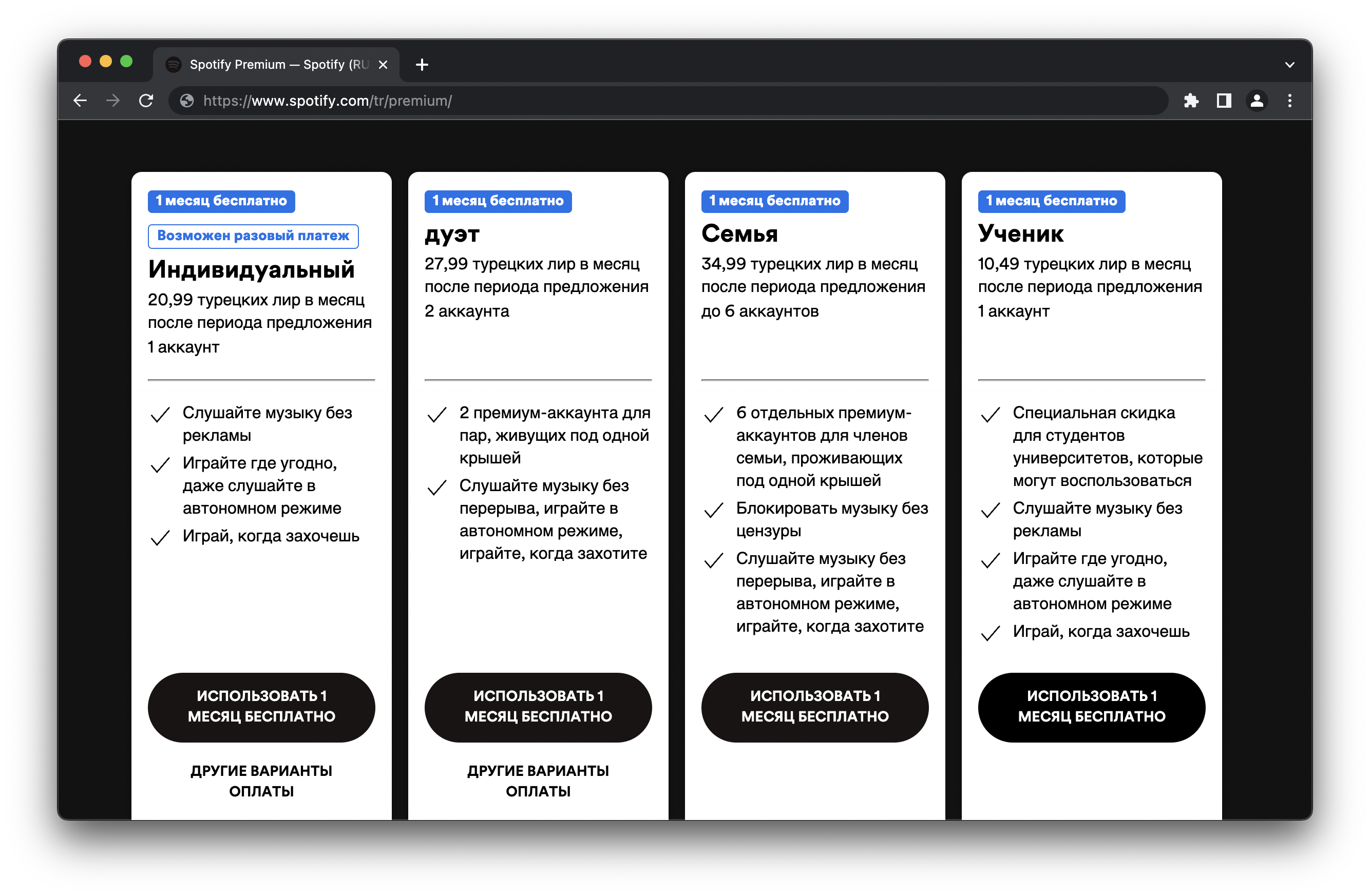 Цены на Spotify Premium в Турции вас приятно удивят – примерно в три раза дешевле, чем были в России до 2022 года. Вы можете получить 1 месяц Premium подписки бесплатно на новом аккаунте, выбрав это предложение в личном кабинете.